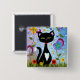 En svart och vit tuxedo-katt sitta bland gräset och blommor i en färgfull trädgård. Att omge henne är blommor och löv och färgstarka former. Hon har den vackraste grönten ögon och bär en röd halsduk.