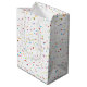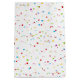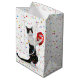 Svart och vit tuxedo-katt som håller en röd party-ballong med färgstark konfetti mot vit bakgrund.