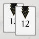 Ett elegant bordskort med enkel stil, denna design har ett geometriskt mönster i art deco-stil med svarta upprepade trianglar i en guldram med simulerade guldknappar. Skriv in era bordnummer genom att ersätta de exempelnummer som visas på kortets framsida och baksida. Ni kan lägga till ytterligare text om ni önskar inkludera namn eller annan information om er tillställning. Detta kort finns i flera andra storlekar för att passa era behov.