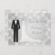 Tuxedo och Gown-set mot bakgrund av Bröllop spara datum-vykort i silver snöflingor