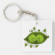 En grönt ärta-pod omgiven av grönt lövs. Inuti den pod som är upphängd är två vackra ärter med det kutaste ansikte.