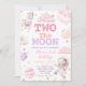 Två Måne-inbjudan till flickrymden 2:a födelsedag. Inbjudan Sweet rymden eller Två på Måne:s andra födelsedag till ett flicka med en liten sol, planet, stjärnor, rymdskepp och rymdfarare. Flickans två Måne är perfekt för ett rymdtema på andra födelsedag party.