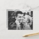 Detta enkla och eleganta spara-datum-postkort har två av dina personliga favoritbilder, med modern och trendig vit handskriven skrift. Baksidan innehåller ett andra foto med en genomskinlig överlagring och mer information om din bröllopsdetaljer.