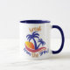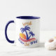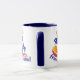 Ett kaffe mugg med två blå handflatan, en orange sol, och krämer av vatten, med frasen "Break from the Grind" centrerad nedanför bilden. Utformningen framkallar ett tropiskt paradis, vilket tyder på att det finns en fredlig flykt från de dagliga stressat.