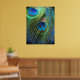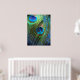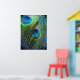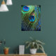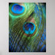 Fotografiet med blå fågelfjäder togs med fisklins från öga. Dessa två fjädrar har en vacker färg för denna poster. Den blå bakgrunden ger ut färg i ögon i påfågelfjädern. Dekorera ditt rum med dessa vackra fjädrar och en perfekt blå.