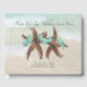 Två stjärnfiskbrider i gästmallen bröllop bok. Två bruna havsstjärnor en blommigt grönt och verkar "hålla händer" på omslaget till den strandade händelsen bok. Anpassa enkelt tre linjer text för rubrik, namn och datum för händelsen. Bakgrunden är en strandscen med sand och surfa och är densamma på baksidan.