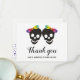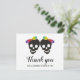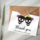 Två skallbrider och konfetti i regnbåge färg Halloween lesbisk bröllop Tackkort-kort. Bröllop har två briders döskallar med bågar i regnbåge i färg, medan baksidan innehåller en mönster av färgstark konfetti längst ned.