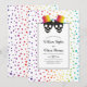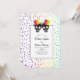Två brudgummar skallar par och färgglatt konfetti i regnbågsfärger Halloween bröllopsinbjudan. Ett roligt skallepar av två brudgummar med regnbågshattar i kombination med ett roligt mönster gjort av konfetti är elementen i denna inbjudan.