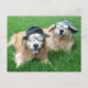 Det här vykortet innehåller ett foto av två leende guld-hämtare hundar som lägger i grönt gräs. De har basebollsocklar och solglasögon och tittar coola!
