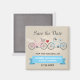 Cykel bröllop är en roligt, en ny trend i bröllop. På denna faux linen-bakgrund, spara datum magneter, träffas två cyklar och skapar ett litet hjärta för att symbolisera det gifta par som ska gifta sig. Brödens cykel har en bröllop-slöja på sätet och en bukett i basket. Groomens cykel har en obunden bockslips inlindad runt handlebarna. Parets namn står i en himlar blå banderoll nedanför. Perfekt för ett cykeltema eller bröllop utomhus. Finns i alternativ färg med tandem-cykelalternativ. com com com.