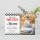Biltemat Cute tävling barn 2-årsdag fotoinbjudan till party med illustration av ett blått vintage bil med lågor. I texten står det: "Uppväxt två gånger snabbare".