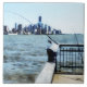 Susan Savad Designs -- En fiskare gör sig redo att fiska från piren i Hoboken New Jersey på en vacker solig eftermiddag med Manhattan skyline i fjärran. Det delvis färdiga Frihetstornet kan ses i fjärran.