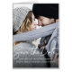 Det här moderna Spara datumkortet börjar med ditt pars foto. Spara datumet skrivs i stor snyggt med vit kalligrafi. Två linjer text nedan gör att du kan anpassa ditt meddelande. Ett speciellt överlägg garanterar att den vita texten kommer att dyka upp oavsett fotot. Inuti kortet finns ett annat foto och ett längre meddelande som du kan anpassa dig till.
