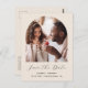 Den här enkla, minimalistiska boho Spara vykortet för datum innehåller ett bågformat foto ovanför orden "Spara datum" i ett vitt handskriftsskript för elegant, följt av parets namn, bröllop datum och stad i sans serif-teckensnitt på en beige bakgrund. Lägg till ett andra, rektangulärt fotot på baksidan, tillsammans med returadressen och ytterligare vågrät med mer information eller information.