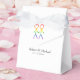 Den här förmånslådan har en vacker och elegant utformning som ger en sammanhängande och meningsfull beröring åt ditt bröllopsmottagande. Bilden på framsidan visar två manar i form av elegant stick figurer, som håller händer. Figurer är färgad i en vacker regnbåge som symboliserar kärlek och mångfald. Den här lådan är ett underbart sätt att hålla små presenter för dina gäster och fira din kärlek-berättelse med alla detaljer på din speciella dag.