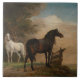 Den nederländska konstnären Paulus-Potterna (1625-1654), som har specialiserat sig på att framställa djur. Den här teckningen visar två hästar i en skugga nära träd och en grind av trä. En av hästarna har en vit jacka medan den andra hästen är mörk brun i färg. Den bruna hästen verkar skrämmas medan den vita hästen står vid träd och tittar på den andra hästen. Båda hästarna har långa svan och maner. Deras öron är uppskakad. I bakgrunden finns det ett grumligt himlar med några fåglar som flyger genom luft, och det finns några kor och andra djur i avlägsna fält. Originalteckningen var målad 1649.