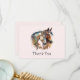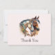 Tack för ditt kort med en bild med ett par hästar. Med dekorativa huvudband. Omavrundat av fjädrar och löv.