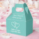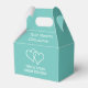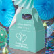 Två hjärtan En kärlek dubbel anpassad bröllopspresentlådor. Sött design med brud och brudgums namn plus datum för äktenskapet. Romantiska sammankopplade kärlekssymboler med slogan. Perfekt för desserter, godsaker, tårta, godis, kakor, cupcakes, munkar etc. Lägg till eget citat eller slogan valfritt. Turkos eller anpassad färg.