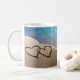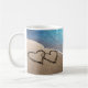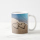 Vackert originalfoto av två hjärtan, skrivet eller ritat i sanden längs blåhavet vatten för att beteckna kärlek och romantik på ett kaffe kopp mugg. Underbart koncept för nästa Alla hjärtans dag, årsjubileum och sommarbadande.
