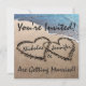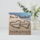 "Ni är välkomna! Brudgumme & Brud ska gifta sig!" står det i stilfull text, (eller ändra formuleringen enkelt), på framsidan av inbjudan med ett originellt professionellt fotografi av två hjärtan skrivna i sanden längs det blå havet för att symbolisera kärlek och romantik. Infoga enkelt brudens och brudgummens namn i varje hjärta som visas för att ytterligare anpassa. Lägg din egen text och detaljer och information på baksidan av denna populära inbjudan. Bra koncept för en kommande sommarbröllop vid stranden, eller en förlovningsfest eller årsdag, familjeåterträff, eller spara datum inbjudningar och meddelanden för det lyckliga paret.