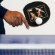 Två japanska koi Goldfish på svart bakgrund Pingisracket