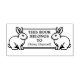 En "The Bok Tillhör to" (Ex Libris)-design med två vita kaniner på båda sidor om en textpanel eller på ett bord. Text skriven i en snyggt-serif-lott i Fet med kursiv stil för namn. Ändra namn för att anpassa sig.
