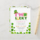 Två Lucky Shamrocks 2-års St. Patrick's Day-inbjudan Postkort. Söt St. Patrick's day-tema baby's andra födelsedagsfest inbjudan "Två Lucky" med läpp-pingvins hatt och shamrock-kaka och lyckosymboler.