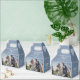 Bröllopsdesign med två foton av nylweds, blå-grått-bakgrund färg med anpassade vita botaniska blommor i monogram - personaliserbart namn och datum.