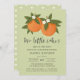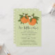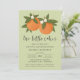 Den här snygga inbjudan till babydusch innehåller en orange med hand plockade/målade färger med små blommar över en bakgrund med anpassningsbar färg (visas med ljusgrön kalk). Snyggtens typografi lyder: "Två små kulisser är på väg!" Baksidan innehåller en enkel, matchande blommar för orange mönster. Underbar för mamman som väntar sig twillingar. Bild/Illustration efter Tracey Khalei/Orabella Prints.