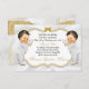 Vackert pojke i sitt döpande halsband mellan kostym och guld kor. Inbjudan har sin bakgrund i vit satäng med guld och silver glitter ram och förskönande av buken. Baksidan är försedd med guld-blomman mönster & guld på en vit satinbakgrund.