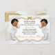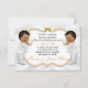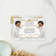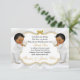 Vackert pojke i sitt döpande halsband mellan kostym och guld kor. Inbjudan har sin bakgrund i vit satäng med guld och silver glitter ram och förskönande av buken. Baksidan är försedd med guld-blomman mönster & guld på en vit satinbakgrund.