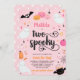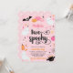 En två-talande rosa Halloween-inbjudan till andra födelsedagspressen, perfekt för din lilla andra födelsedag. Med vidlyftiga skämtspel och pumpillustrationer.