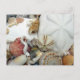Sjöskal fotografering vykort. Bilder av vackra sniglar som sjöbröd sand dollar, solur, sjöborre, rosa och orange hjärtsnäckor, lockiga masksniglar och annat marint liv täcker framsidan. Baksidan är tom för att användas vid alla tillfällen, eller skicka från en tropisk strand semester.