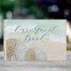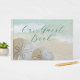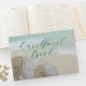 Bröllop gäst bok med strandtema och två sanddollar. Spridningsskript i blå grönt är "Vår gäst bok" över en strandsandbakgrund med två, realistiska natursanddollar.