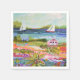 Två segelbåtar och stuga I av Karen Fält. Roligt med blommor, träd, stuga och segelbåtar ute på vatten.