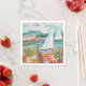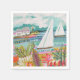 Två segelbåtar och stuga II av Karen Fält. Två segelbåtar flytande i vatten omgivna av färgstarka blommor och stugor.