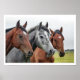Fotografi av tre hästar, som visas från nacke uppåt, som står bredvid varandra, två segment med grått i mitten.