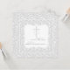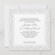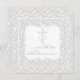 Kristet kors med sammanflätade vigselringar på vit infälld yta mot elegant silvergrå damastvirkad bakgrund, sofistikerad fyrkantig bröllopsinbjudan med bibelvers ur Markusevangeliet 10:7,8: "Därför skall mannen överge sin far och sin mor och hålla sig till sin hustru, och de två skall bli ett kött. Så är de inte längre två utan ett." Fira er vigsel medan ni delar er kärlek till Kristus med denna prisvärda personliga och anpassningsbara silvergrå och vita inbjudan från The Christian Faith Gift Shoppe.