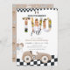 Vintage racerbil 2-års födelsedagsinbjudan, pojke beige racerbil två snabba andra födelsedagsinbjudan med foto