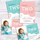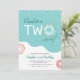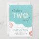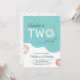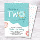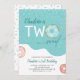 Den här söta tealen födelsedagsfest inbjudan är designad för en flicka som vänder 2. Den moderna texten lyder "(Namn) är två söta" accentuerad med en frostig donut med sprinkler.