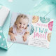 Cute second födelsedagsfest inbjudan-funktionen "[namn] är två söta" med information om party under, omgiven av illustrationer av vattenfärg i neutralter, rosa och lila. Lägg till ett foto av födelsedagsflickan för att slutföra den här söta och vismska designen.