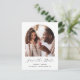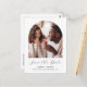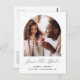 Den här enkla, minimalistiska boho Spara vykortet för datum innehåller ett bågformat foto ovanför orden "Spara datum" i elegantens svarta handskriftsskript, följt av parets namn, bröllop datum och stad i sans serif-teckensnitt på vit bakgrund. Lägg till ett andra, rektangulärt fotot på baksidan, tillsammans med returadressen och ytterligare vågrät med mer information eller information.