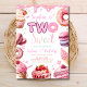 Firar din lilla lilla milstolpe med den här vackra "TWO Sweet"-födelsedagsinbjudan! Perfekt för en flickas andra födelsedag party, den här redigerbara inbjudan innehåller ett roligt rosa desserttema med nötter, muffinsar, glass, makaroner och sprinkler - allt i drömmande pastel färg.