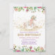 En vacker enhörn i vattenfärgad hand, färgad stil, omgiven av ömtåliga blommor och mousserande guldstjärnor glitter. Ett inbjudningskort för att fira ditt barns andra födelsedag.