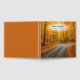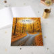 En serene-skogsscen fångar upp en väg som vrider sig i två delar mitt i träd, med vibrerande gyllene löv. Text kan ändras.