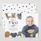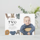 Barn av kute och roligt: Andra födelsedag - inbjudan till fester med illustration av safaridjur av giraffe, snö leopard, rhino, lejon, elefant och zeebra. I texten står det "XX är TVÅ vilder". Du kan lägga till ditt barns bild. Perfekt för en pojkes födelsedagsfest.
