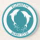 Två vitbanhoppningdelfiner med bubblar för vitdelfiner för vit som gulliga silhouettes förbereder sig att hoppa från vatten på turkoshavsbakgrund med krökt text med ditt namn, eller ditt namn och din älskade en och beställnings- text som du kan fullständigt personifiera. Perfekt för födelsedag eller årsdag