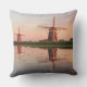 Fotodekorativ kudde dämpar med två windmills längs en flod med reflexion i lugnt vatten i solnedgången lätt på en sommarafton i Nederländerna.
