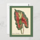 Ett finkonstkort från Curtis Botanical Magazine med en digitalt förbättrad illustration av ett livfullt rött och grönt Caladium-blad.