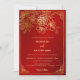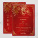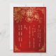 Denna eleganta kinesiska bröllopsinbjudan har en gyllene dubbellyckssymbol och gyllene blommor på en blomsterlik röd skimrande bakgrund. Brud och brudgummens namn i ett elegant handskrivet typsnitt. Kinesisk bröllopsinbjudan eller tebjudningskort. Med en traditionell kinesisk text på baksidan.